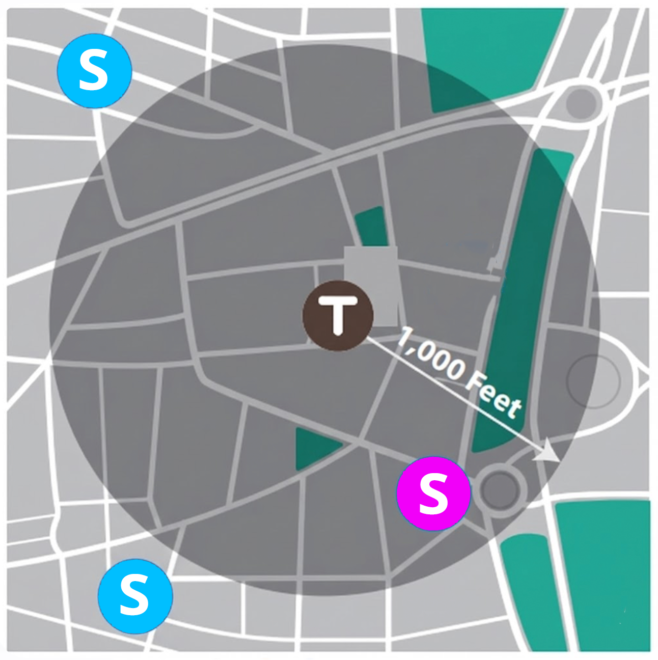 Proximity to Schools - A commonly used measure is 1,000 feet between tobacco retail and schools and other youth-oriented locations (CDC 2019, Ribisl et al., 2017). 1,000 feet is about 2-3 city blocks and a 3-4-minute walk on level ground. This interactive report allows the user to identify: